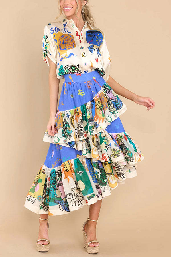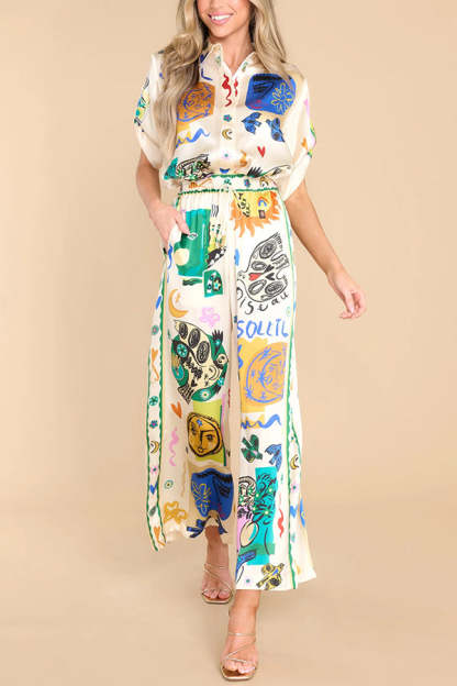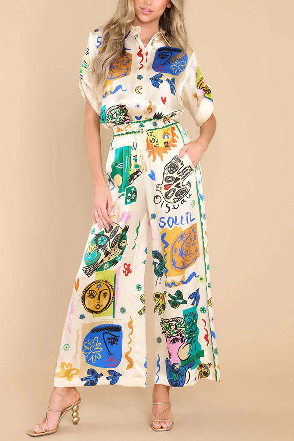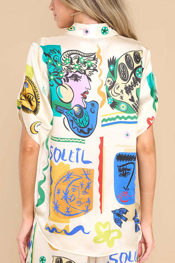 Sun Tribe Satin Unique Print Button Down Oversized Blouse